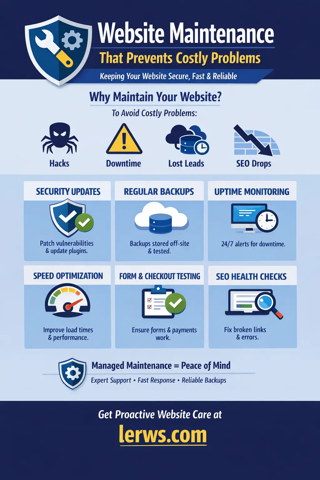 If you want website maintenance that prevents costly problems such as security issues, downtime, broken forms, slow performance, and SEO setbacks then reach out to lerws.com. Whether you need a monthly maintenance plan, faster-response support, or a full site health audit, the goal is the same: keep your website stable, secure, and working for your business.